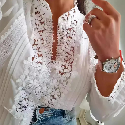 Weißes Patchwork-Top mit Blumenmuster und Spitze für Damen🌷✂️Exquisite Details unterstreichen das Design